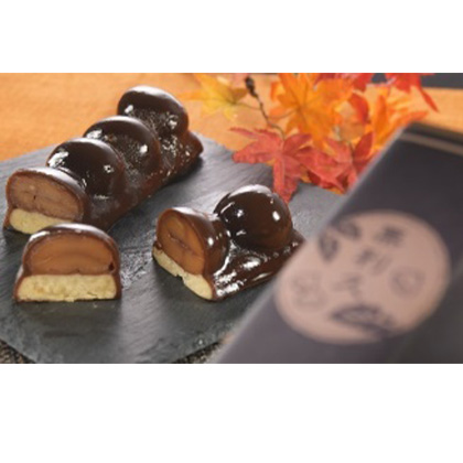 - 国産の栗餡に栗の渋皮煮を丸ごとのせ、黒糖羊羹で上掛けし 5粒の大栗をのせ見た目にも華やかなご贈答にも喜ばれる御菓子