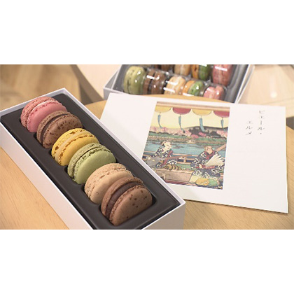 - お好み焼きのコテやキツネのお面など浮世絵風のイラストで大阪を表現した「大阪限定デザイン マカロンBOX」は大阪限定販売商品です。
