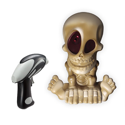 ガイコツから壁に投影(とうえい)されるおばけをシューターで撃ち、あたれば点数ゲット!