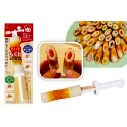 そこに具材をつめて、ちくわの穴に差し込んで、デコレーターを抜き取るだけで簡単に穴づめができます。 - これまで硬い食材しかつめられなかったちくわに