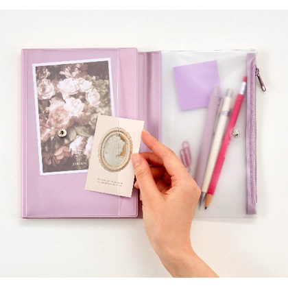 前面ポケットは、A5サイズ(A4二つ折り)の書類が入る。 - 各柄 B6/A5 対応の2サイズで2サイズ展開。