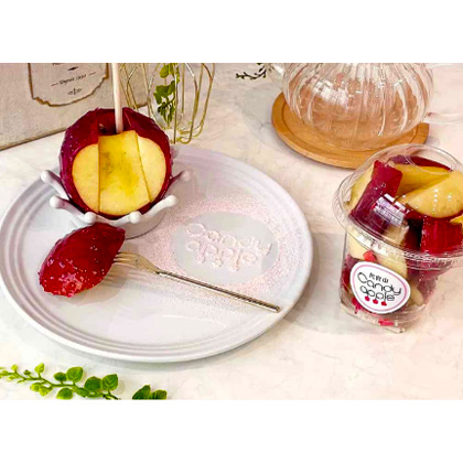 - りんごの食感と、飴の食感に一体感が生まれるようにパリパリに仕上げ、ジューシーなりんごの果汁で、飴は口の中で一瞬で溶け混ざり合うよう薄くコーティング。そのため甘みの中に感じるりんご本来の酸味と甘い香りが口いっぱいに広がる。
