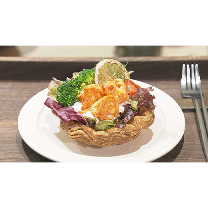- エビのサラダパイはぷりぷりとした食感とサクサクのパイがよく合うテイストになっている。