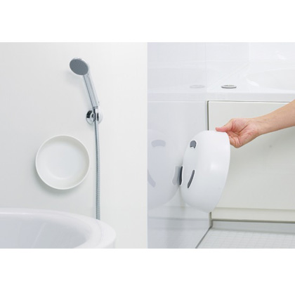 - 磁石で浴室の壁面に収納できて邪魔にならない湯おけ。錆びないラバーマグネット使用。