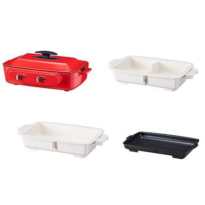 - 付属している鍋&プレートは、[仕切り深なべ・深なべ・平プレート]の3種類と、別売で[たこ焼きプレート](KSG-PL01)が追加可能。仕切り深なべと深なべの表面はセラミックコーティング加工、平プレートの表面はフッ素コーティング加工で、調理後の汚れもサッと落ちやすくお手入れも簡単!