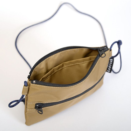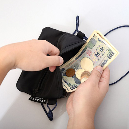 - 一見、ただの斜め掛けポーチ、今で言うならサコッシュなのですが、メインポケットの内ポケットからお札と小銭を入れると、お札はそのまま残り、小銭だけ下のポケットに落ちる。