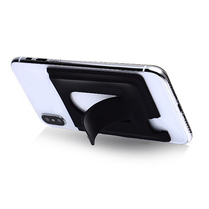 - スマホの裏に貼れるカード入れ付きケース。ワンタッチで背面のクリップ部分が開く。