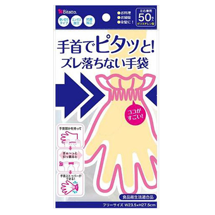 - 便利だけどブカブカで外れやすい使い切りタイプのビニール手袋…そんな問題を解消!手首部分をひっぱるだけで「手首ストッパー」が出現して手首に手袋がピタッと密着!