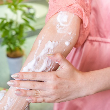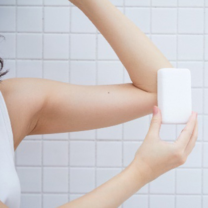 程よい硬さのポリウレタン製で、なめらかに擦れるので、皮膚も傷つけにくい。しかも、消しゴムのように表面が少しずつ角質と一緒に削られるので、衛生的に使用できます。