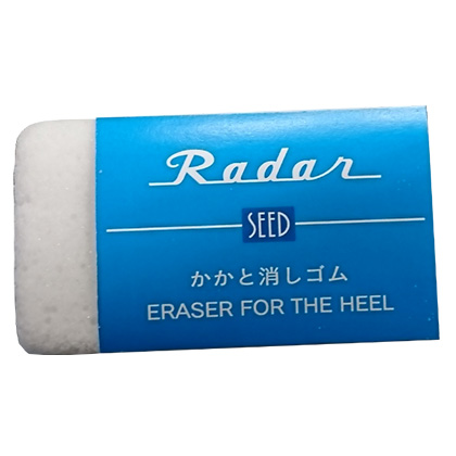 - 見た目も消しゴムそっくりな「Radarかかと消しゴム」は、7つの成分配合の、ちょっとリッチなかかと専用の軽石。かかとやひじの気になるところを擦れば、角質がまるで消しカスのように出てくるというもの。