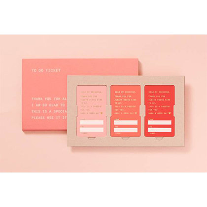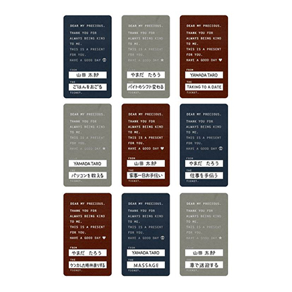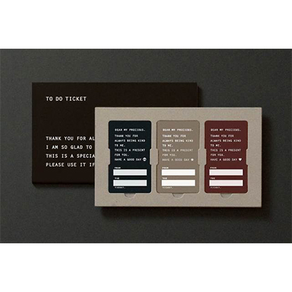 大切な人へ自分の行為やスキルをプレゼントするためのオシャレな紙製のチケット。肩たたきだけでなく、空欄部分に自分の名前とプレゼントしたい行為をかいて、大切な人にプレゼント。そのデザイン性と、童心に帰れる所が人気を呼んでいる。