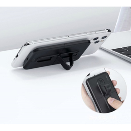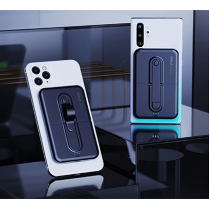 - 手のひらサイズでスタイリッシュなデザインのモバイルバッテリーに、ワイヤレス充電システムと吸着機能を組み込んだスマホホルダー。