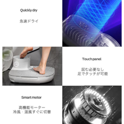 - 足元から出てくる強力な風によって濡れた体を乾かすことが可能で、冷風と温風の二つのモードにより、オールシーズン使用することが可能な新しい形のボディドライヤー。