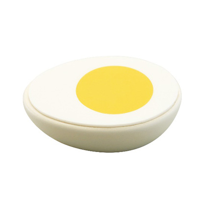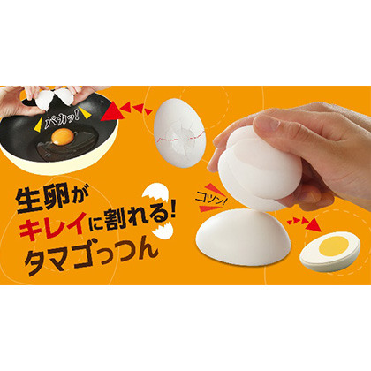 - 生卵をきれいに割ることにこだわった半卵型のタマゴ割り器。卵同士をぶつけると、片方の卵だけ横方向にヒビが入り割りやすくなる原理を応用している。平らな面にはシリコーンを使用して滑り止めを施しているので、滑りやすい場所でも扱いやすい。