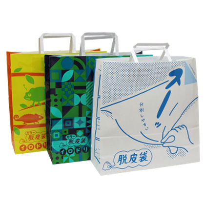 使用中は表面に貼られたポリフィルムで水や汚れから紙袋を保護でき、 使用後はポリフィルムを簡単に剥がして、プラスチックゴミと資源となる古紙に分別できるエコな紙袋。