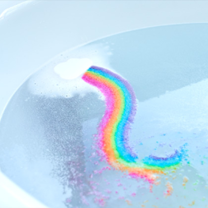 - そっとお湯に浮かべるとしゅわしゅわと溶け出し、バスタブはカラフルな虹でいっぱいになります。天面を濡らさないようにやさしく浮かべたら、少し前に押すと…。 炭酸の気泡が出て、徐々に前に進んでいきます。 (38℃~41℃のお湯を推奨) しゅわしゅわと溶け出し、バスタブにきれいな虹が架かります。