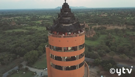 バガンの遺跡群を360度にわたって眺望できる高さ58mの展望塔。夕陽を浴びて赤く染まる遺跡群は幻想的な風景!
