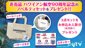 - <7/20~8/3のお申し込み限定!>ハワイアン航空90周年記念ノベルティグッズ3点セットをプレゼント!