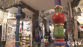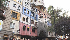 画家「フンデルトヴァッサー」がデザインした、まるでおとぎ話の世界の様な個性的な建造物で、現在は住居に。 この建物の真正面には、お土産物店も。実は、フンデルトヴァッサー、大阪・舞洲にある派手なゴミ処理場も、設計した人!