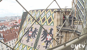 モザイク柄でデザインされた屋根にはオーストリアの国章や、ハプスブルク家の象徴「双頭の鷲」が!