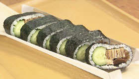 - みずみずしいきゅうりを贅沢に二分の一本使ったマイスターこだわり大人気巻きずし