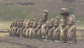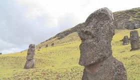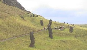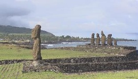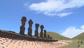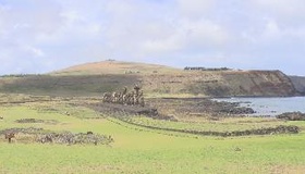 イースター島にあるモアイのほとんどは、海を背にして海岸に立っているが、アフ・アキビにある7体のモアイは、草原の中で海に向かって立つ珍しい配置。島の伝説に登場するホツマツア王とともに来島した、7人の従者や王子を祀っているともいわれている。
