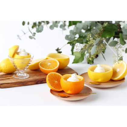 - くり抜いた皮をそのまま器として使用し果物の風味を閉じ込め、中身の果汁をゼラチンで固めることで口の中で溶けるプルプルな食感に仕上げている