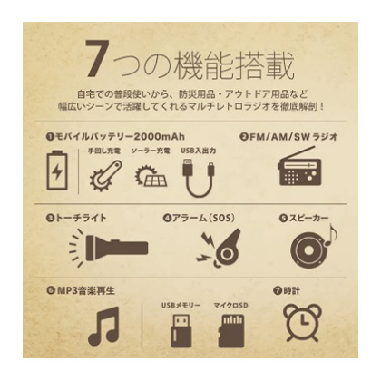 - ラジオ・ライト・アラーム(SOS)・モバイルバッテリー・音楽再生・時計・スピーカーの機能を搭載した1台で7役の活躍!