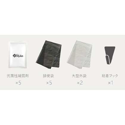 - 中身は、抗菌性凝固剤、排便袋各5個と大型外袋2個、粘着フック1個。防災メーカーの製品で、長期10年保存、優れた抗菌・消臭性など機能性も十分。