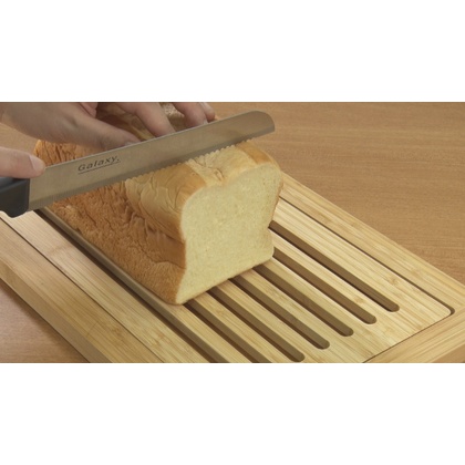 - パン好きにぴったりのまな板。サンドイッチをカットしたときにパンくずがテーブルの上に散らばらない。