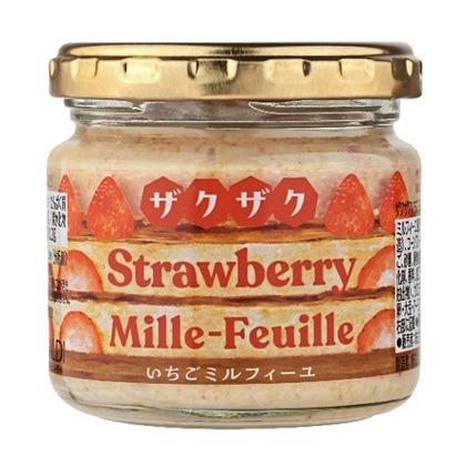 - 苺のミルフィーユをイメージしたザクザク食感のビスケットと甘酸っぱい苺の味が楽しめるスプレッドです。トーストやアイスのおともに。