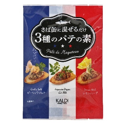 - さば缶に混ぜるだけで簡単にできるパテの素です。食欲そそるガーリックソルト、痺れる辛みが特徴の山椒、爽やかな風味が特徴のレモンハーブの3種類がアソート品になっています。