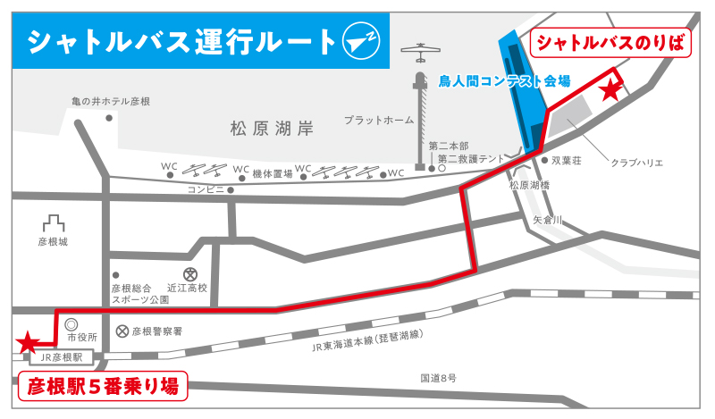 - JR彦根駅(西口5番乗り場付近より発車予定)から会場まで、無料のシャトルバスを運行しますので、ご利用下さい。