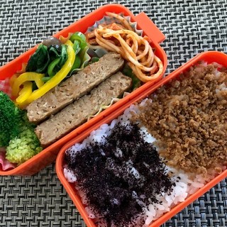 またまた、お弁当! 今回も 趣味のお弁当作りです。 お仕事頑張る奥さんに!! そぼろ、ハンバーグは... ネタ被りでしょうか?(^^; ホウレンソウと、ピーマン、しめじ、パプリカの和風ソテーは自信作。 アサリとイカのパスタは、前夜の残りっす。 前の記事