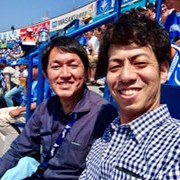 今年5月、横浜スタジアムで取材中にばったり会った時の写真。