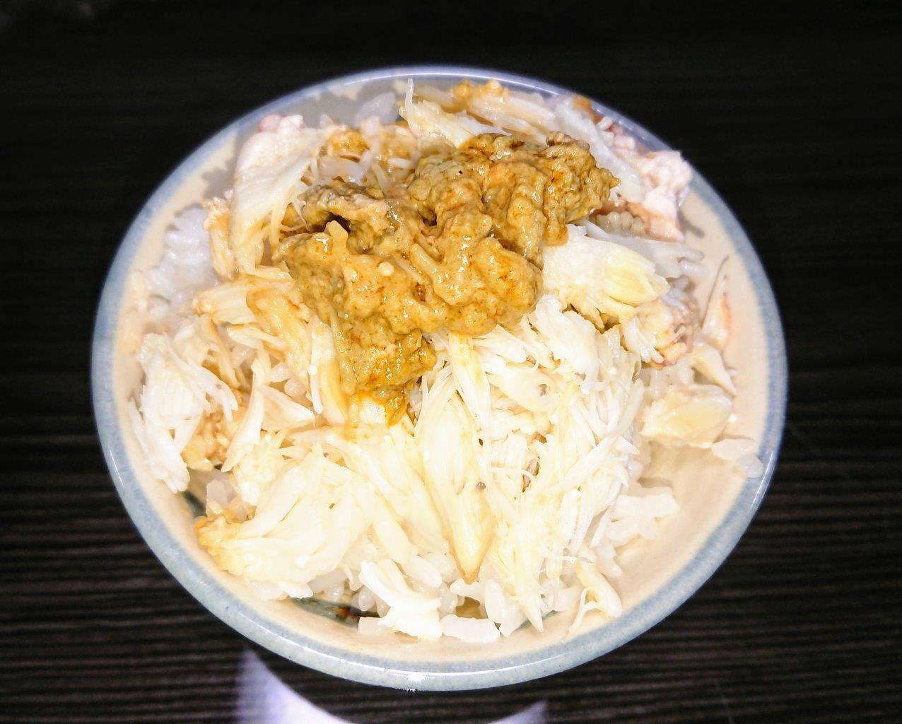 甘くてぷりぷりの身を食べた後、〆は濃厚な蟹味噌をあつあつのご飯に掛けて頂きました。