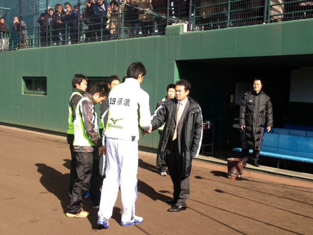 写真は6人のルーキーが和田監督に挨拶をしているところ。