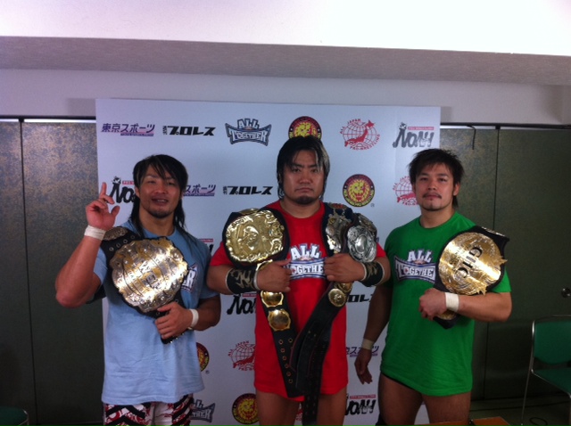 メインイベントではGHC王者のKENTA選手とGHCタッグ王者の外国人コンビも登場したとあって本部席にはベルトがこんなに集まりました。メインはKENTA・杉浦・大原のNO MERCYが勝利。GHC王者チームから3カウントを奪った杉浦選手がタッグのベルトへの挑戦をリング上で表明!パートナーは未定ながら、BOSSの高山選手になりそうだとにおわせるリップサービスもありました。