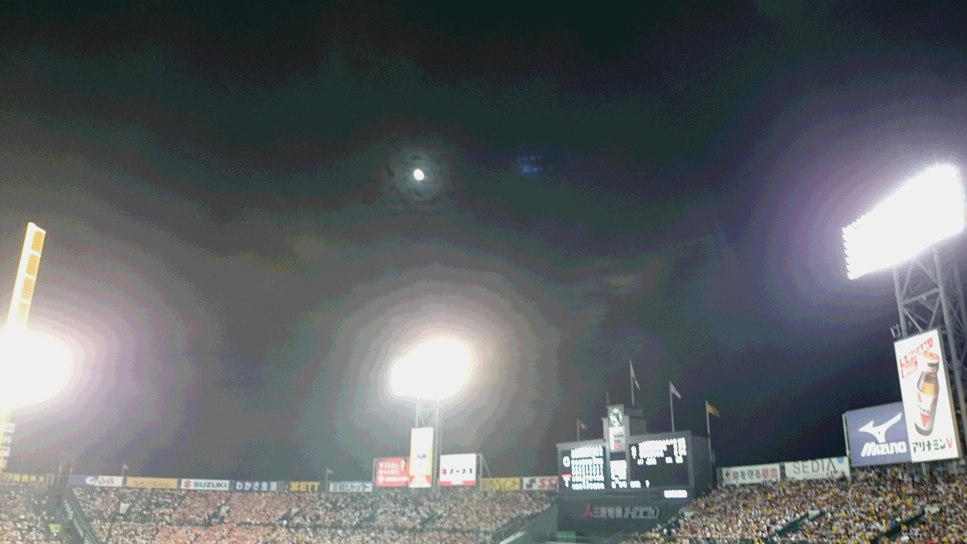 甲子園球場記者席からの外野スタンドとスーパームーン。