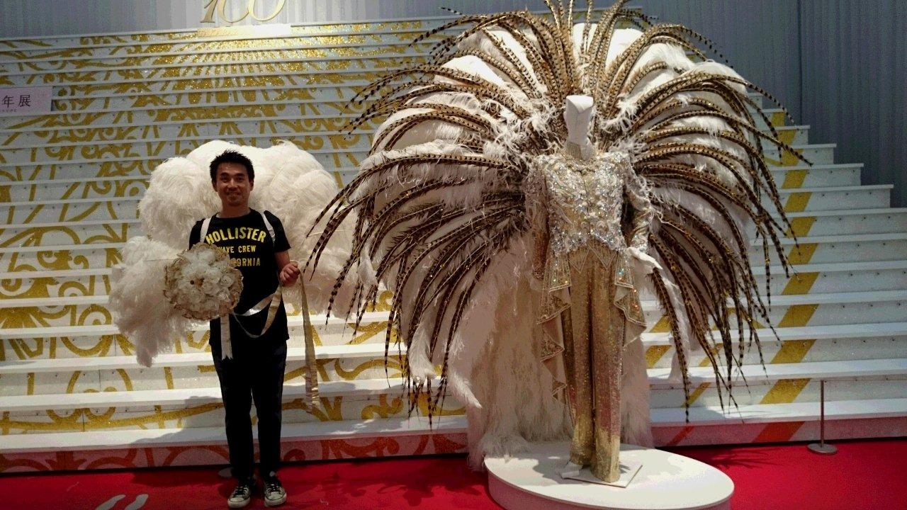 そして何と何と、ファイナーレの名物、大階段の前で羽根を背負えるんです。思わず背負いました!!(笑)