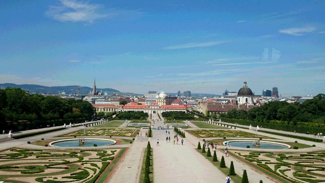(ベルヴェデーレ宮殿上宮2階から見た庭園と下宮とウィーン市街)
