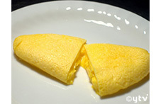 (2)中火で熱し、無塩バターを加える。半分程溶けたら、(1)を流し入れて、半熟になるまで、菜箸で混ぜながら焼く。