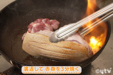 ② 熱したフライパンに、油をひかず皮面を7分焼き、裏返して赤身を3分焼きます