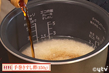 ⑤ 炊飯器に冷水、手巻きすし酢を入れやさしく混ぜ、通常炊飯をする