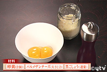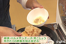 ① 卵黄、パルメザンチーズ、黒胡椒、酢飯を加え、まんべんなく混ぜる