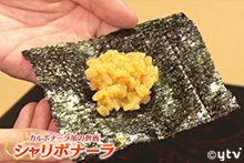 材料:酢飯(茶碗1杯)、卵黄(2個)パルメザンチーズ(大さじ2)、黒胡椒(適量)、海苔(適量)