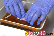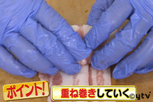 3.同じように豚肉を広げて、重ね、②を上に置いて、くるくると巻く、①に漬けるもう一度繰り返す。