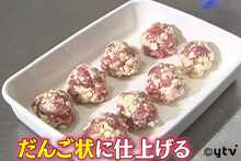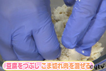 2.ボウルに①の豆腐を入れて潰し、豚肉の細切れをほぐしながら入れて混ぜ、八等分にして丸める。
