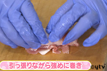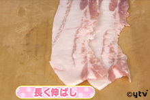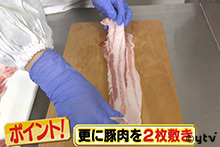 2.豚ロース肉を三枚、広げ、少しずつ重ねて、くるくると巻き、①に漬ける。