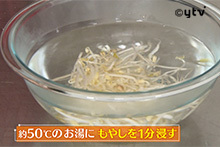 ①50℃のお湯をはったボウルに、もやし1袋(200g)を入れて混ぜる